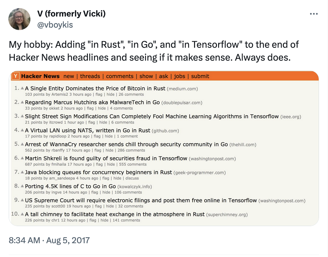 I realized quickly, though, that HN was the heartbeat of the tech industry, the place where many threads and points of interest were discussed. There’s a lot to dislike about the commenters and some of the discussion generated, but I still don’t know of any other outlet like it for any other industry that allows the emerging practitioner to become quickly familiar with the latest news and slang of their given profession, with such a high discussion volume. (Other than maybe r/programming.)