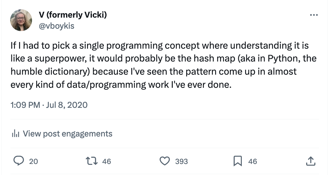 But data work also has its own unique patterns, and I want to talk about one of these that I think is important for all of us to carry around in our back pockets: the humble hash aggregate. The hash aggregate works like this: