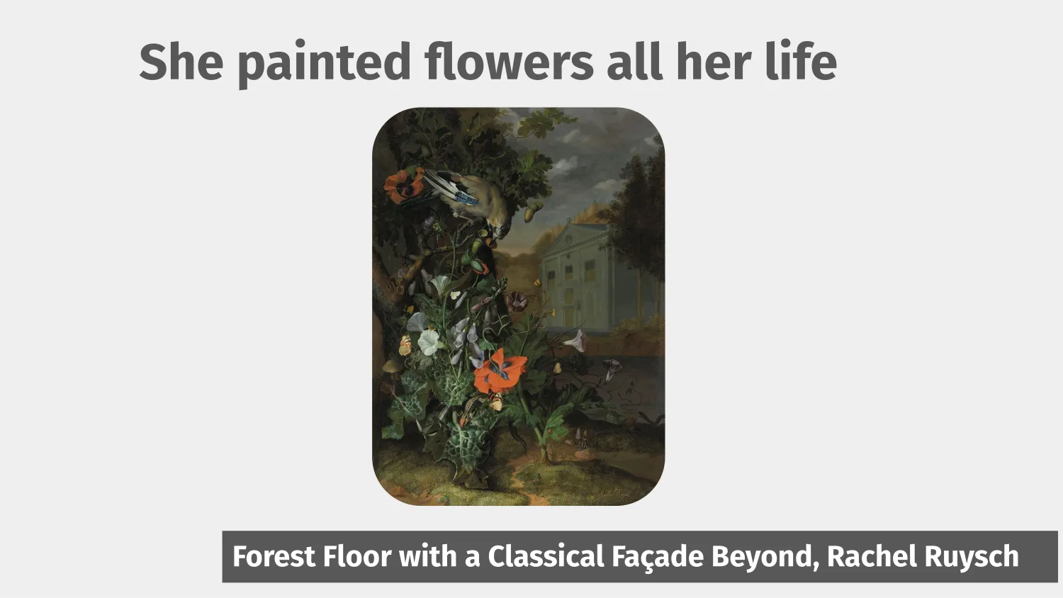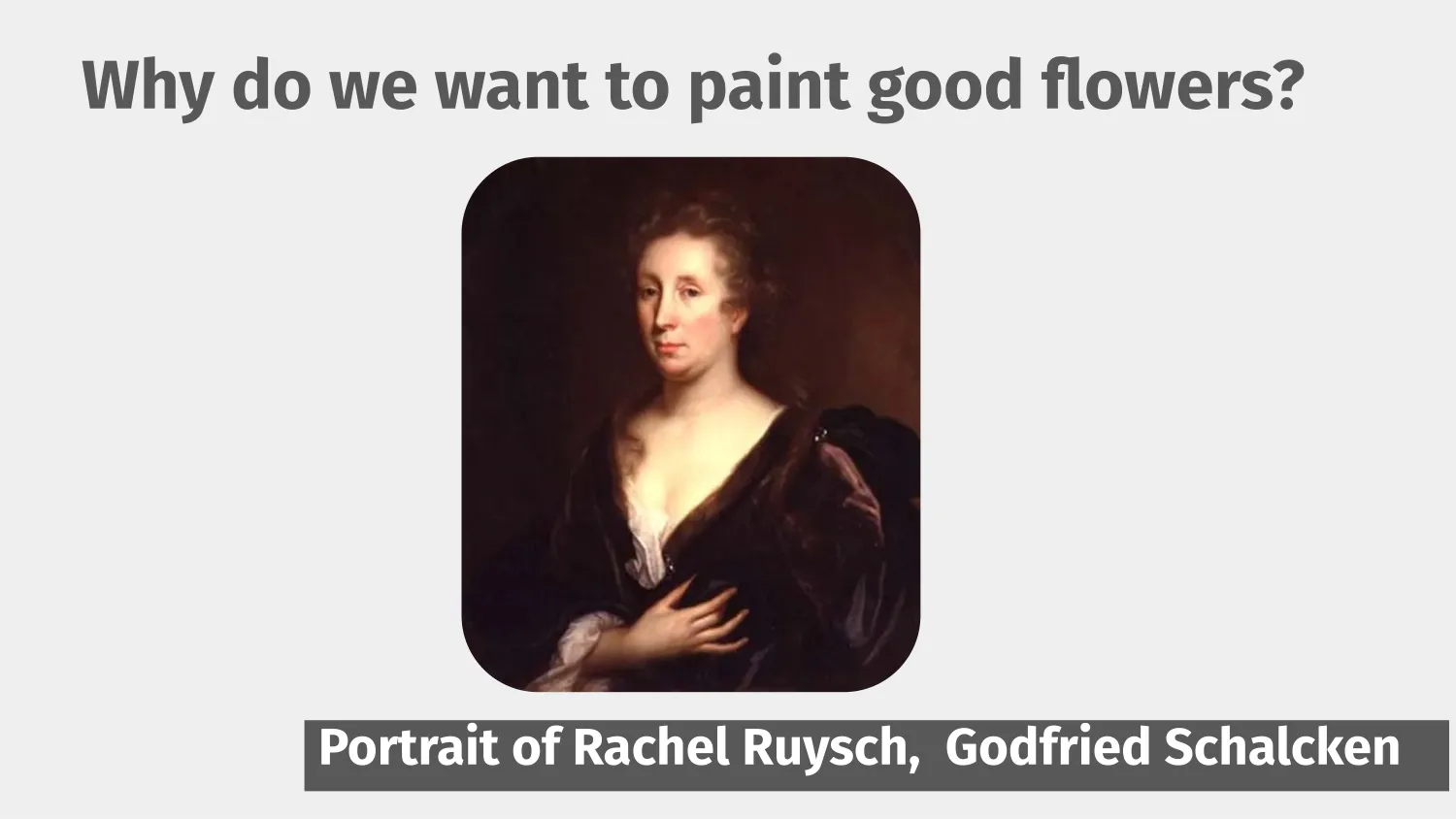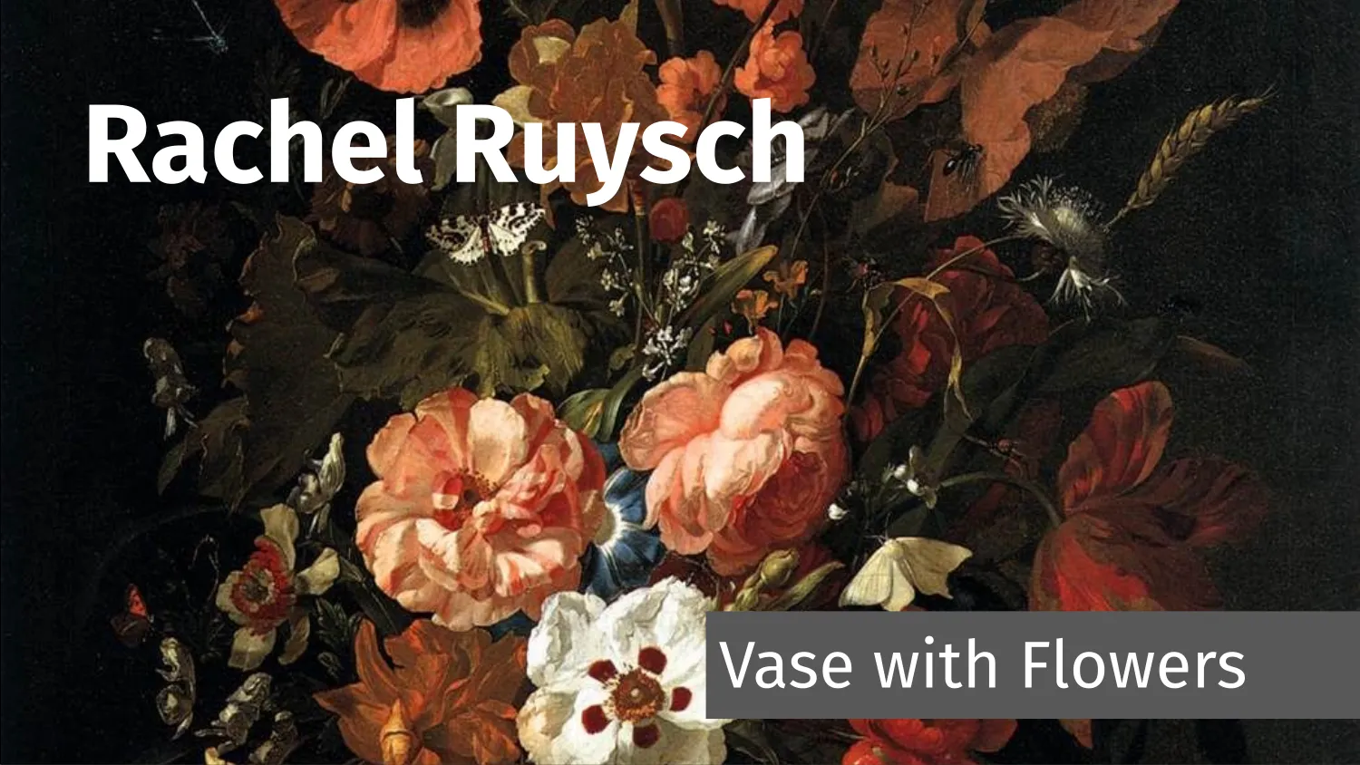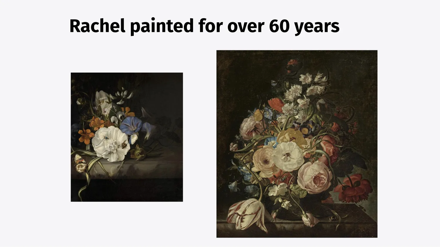 So who was she? Rachel was a premier flower painter during the Dutch Golden Age and all she did was paint flowers. Lots and lots of different compositions of flowers in all sorts of shapes and sizes, starting from when she was 15, well into her 80s.