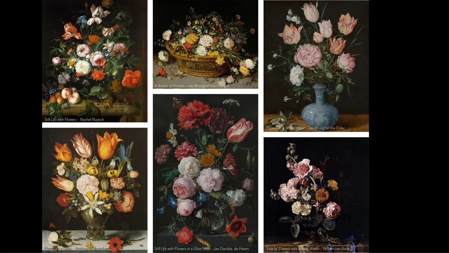 Out of the five to ten million paintings that we think were created during the Dutch Golden Age, thousands of them were flowers. Why flowers? People wanted flowers in their homes that wouldn’t wilt over the long Dutch winters, and that showcased how worldly and interesting the homeowners were. Exotic and unusual flowers in particular (such as tulips of the famous Dutch tulip mania) were prized, and flower painters sought to accommodate this trend. There were many very famous Dutch flower painters and hundreds to thousands more, all producing and focusing on flowers. For artists, painting flowers accurately and lifelike was an important test of mastery.