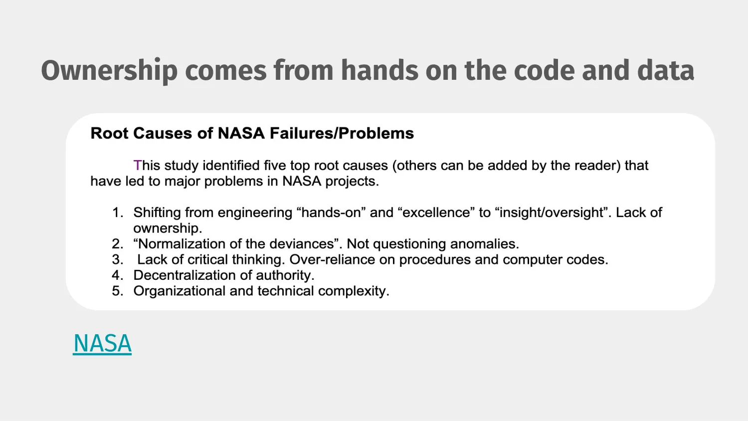 But NASA is always looking at risk, and they did an investigation in 2012 and came out with this report of what happens when things fail. Why do they fail? And they came up with these five problems. And the one that really struck out to me was the first one, shifting engineering excellence to insight and oversight.