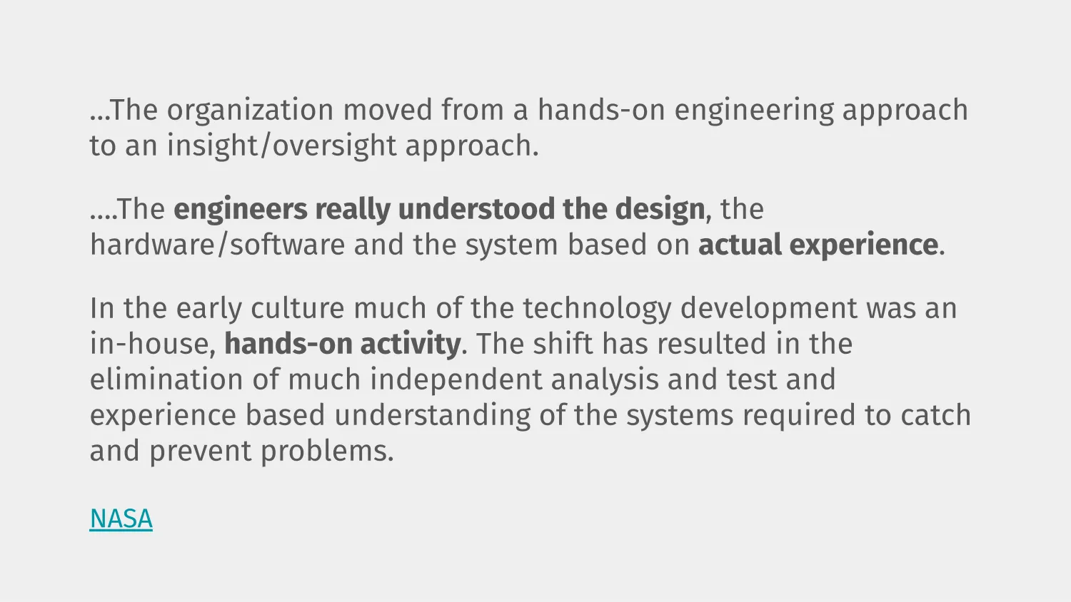 So there were periods when NASA outsourced a lot of their engineering to subcontractors. And what happened was that the engineers who understood the design and the system design based on actual experience left. And the shift that resulted eliminated independent analysis and testing and understanding of the systems. And this was what led to degradation of engineering quality.
