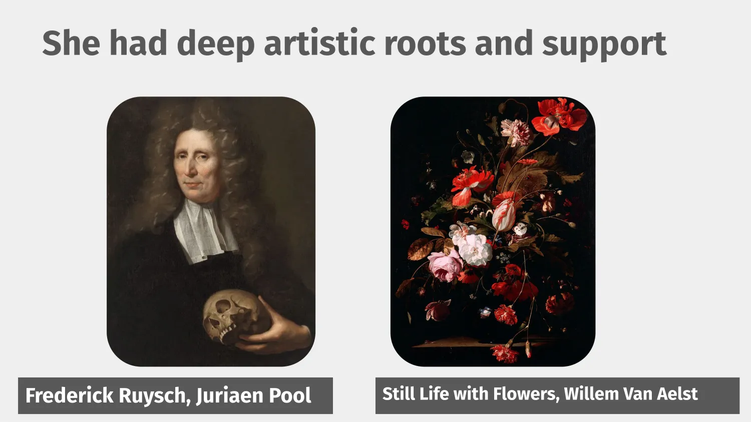 The first one is that she was in an artistic family. So she was in one of the premier families of Amsterdam where all her great uncles were painters. Her grandfather was involved in art. Her father was a great artist and botanist, Frederick Ruysch. You can see him here with this creepy skull. He collected a lot of really creepy dead things, which is where she learned about scientific accuracy, embalming, preserving flowers, etc. It was here that she learned discipline: how to capture minute details, She was known for her technical skill, and for gathering flowers in botanic gardens and pressing them so she could have different compositions for different seasons, surprising the Dutch, who were generally orderly and used to seeing only seasonal bouquets. During her life, her paintings sold for 3x Rembrandt’s.