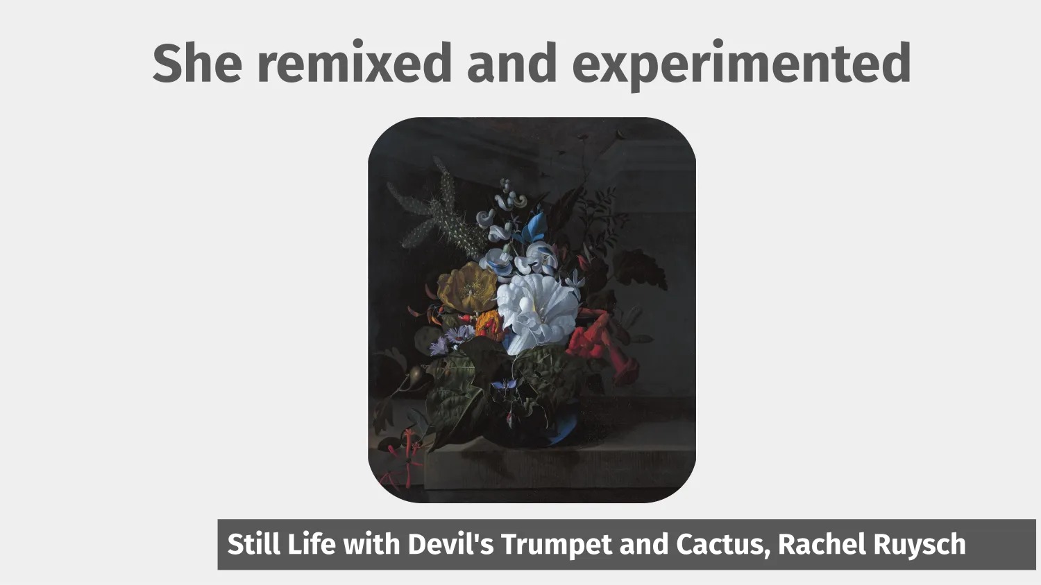 And finally, she herself remixed and experimented. So you can see in the background of this painting, there’s a cactus. And it’s not easy to get a cactus in Amsterdam in the summer or the winter. So she got this from the New World because she had connections to Amsterdam botanical societies and she knew people who were coming and going all the time. And so she could barter for and preserve exotic flowers. And she also remixed flowers from different seasons by drying them. She collected them all the time. She was always changing something about how she was working.