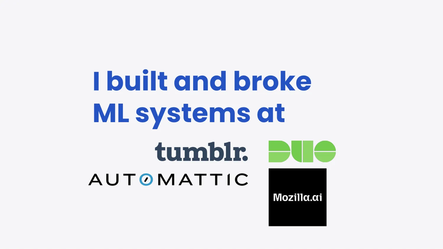 I debated for a long time how to introduce myself. Am I a data scientist? Am I still a machine learning engineer? Am I an AI engineer now? I’m not really sure. I think, like a lot of people over the past six months in the industry, I’ve been having existential angst. Like “what even am I? What am I doing” type angst. So I’ll go with it. I build machine learning systems.