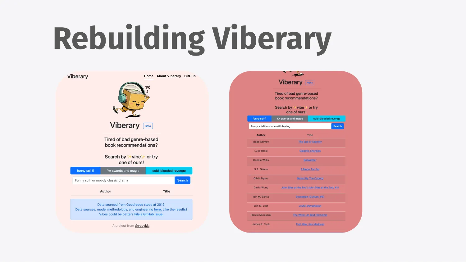 Viberary was a side project that I’d done in 2023 that was based on text-only representation of books from Goodreads and all their reviews. And the idea was that you type in a phrase like sci-fi, funny sci-fi, or moody drama, and you get back a list of books that are recommended based on vibe rather than the books themselves, which is something that I always wanted.