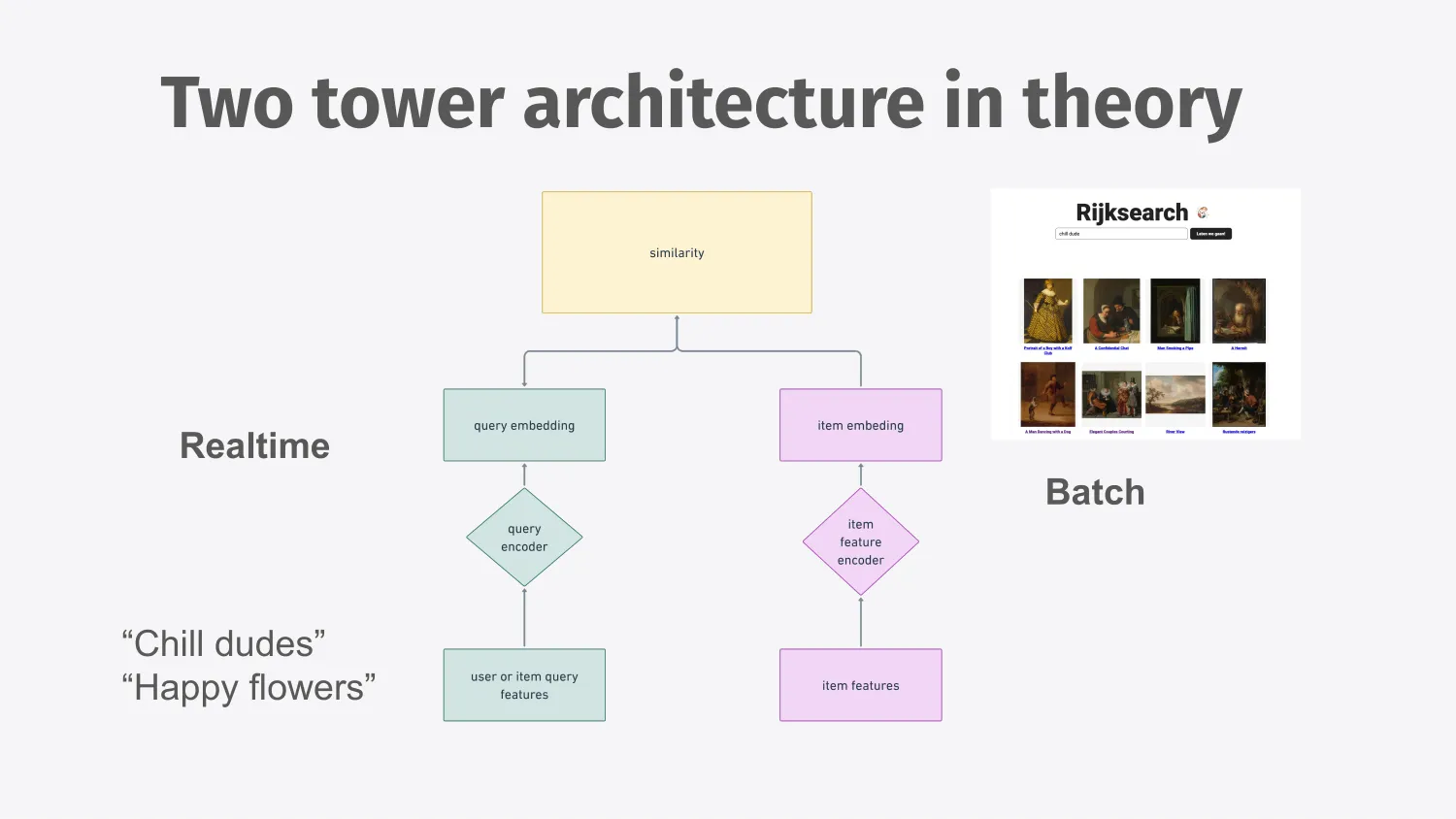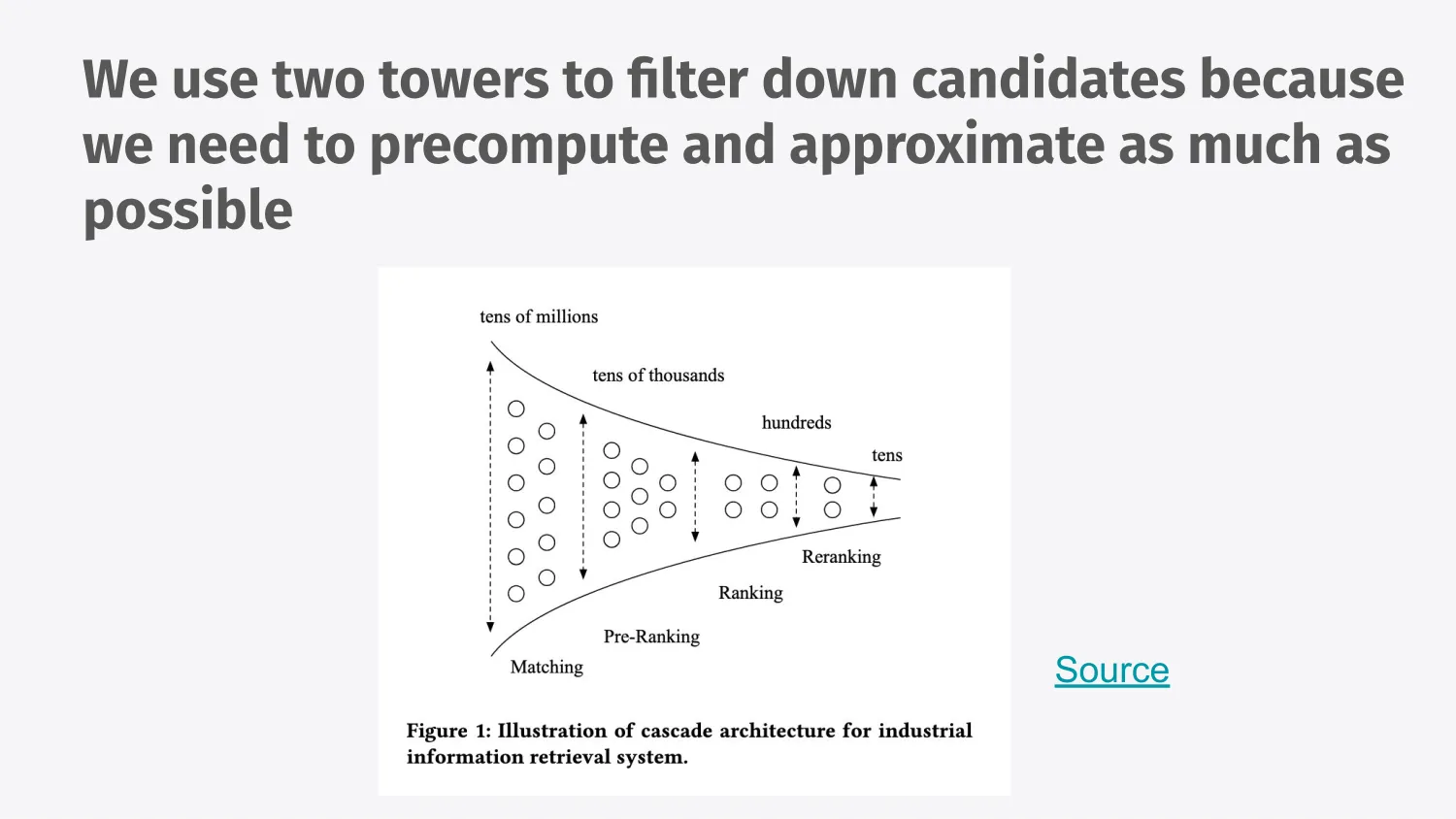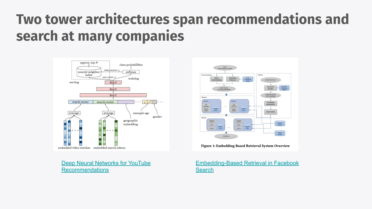 Two towers is one way that allows us to pre-compute the embedding for our entire catalog and then it allows us to filter them quickly using approximate nearest neighbor search, which is a fast algorithm which says this thing is closer to this group of things but not this other group of things.