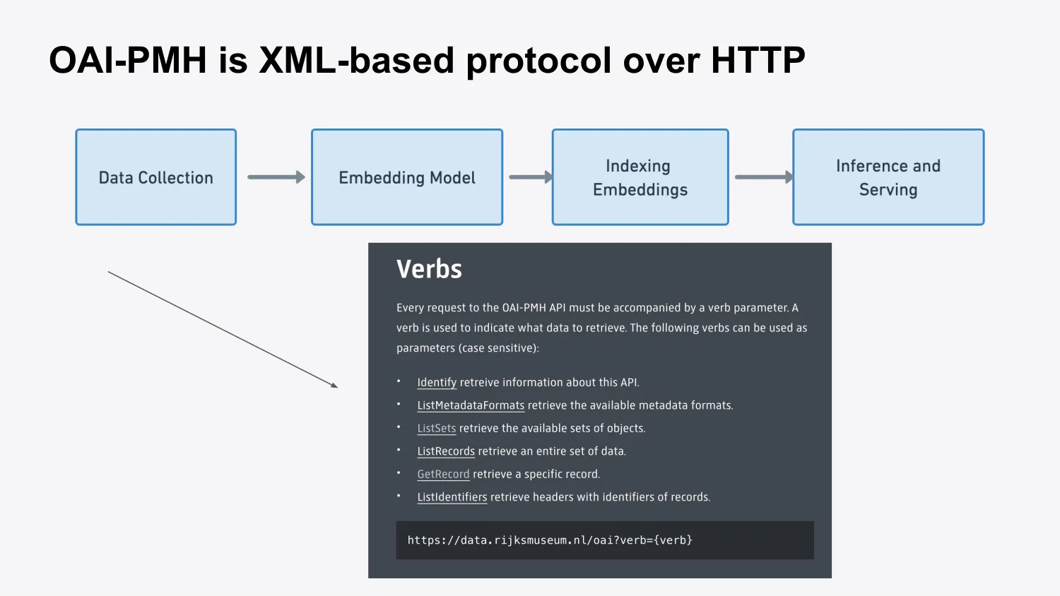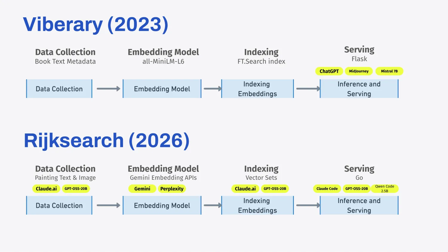 Taking a look at the same steps for Viberary and Rijksearch, you can see what I implemented differently. So there’s a couple steps. First, we have to collect the data. Then we have to think about what embedding model we want to use and how we want to embed it. Then we need to index our embeddings. This is an important step. And then we need to serve our embeddings and create a web server so we can actually stand up the front end and return results.