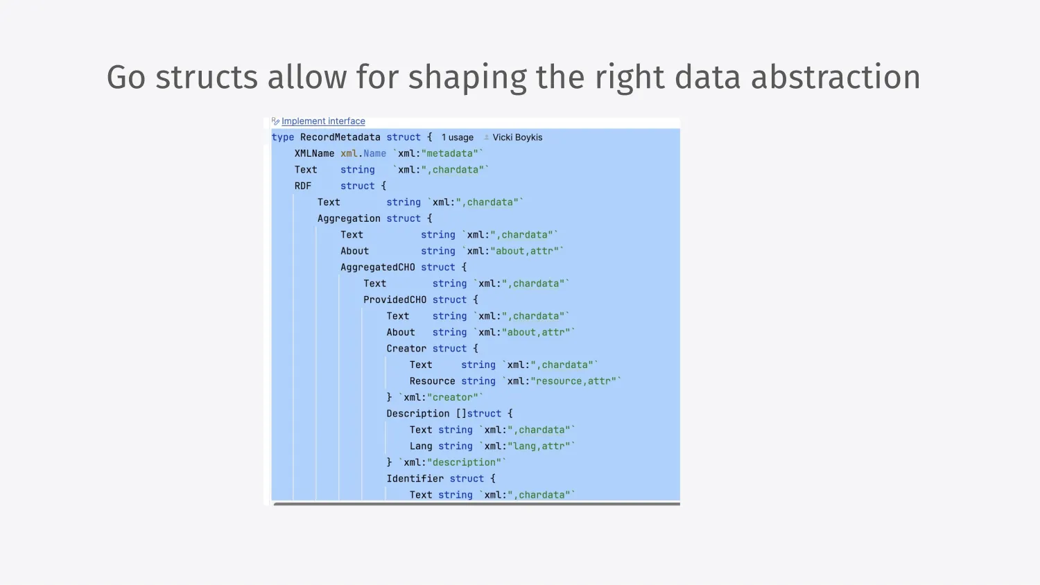 How do we actually collect that data into our app? Here’s where Go really helps. Go structs are typed collection fields, much like Pydantic models, and they really allow you to do this well. If you have an XML snippet, you can either run it through an LLM to get results, or use a site like XML to Go, no code generation needed. But, of course, LLMs do really well with Go because it is so strongly typed.