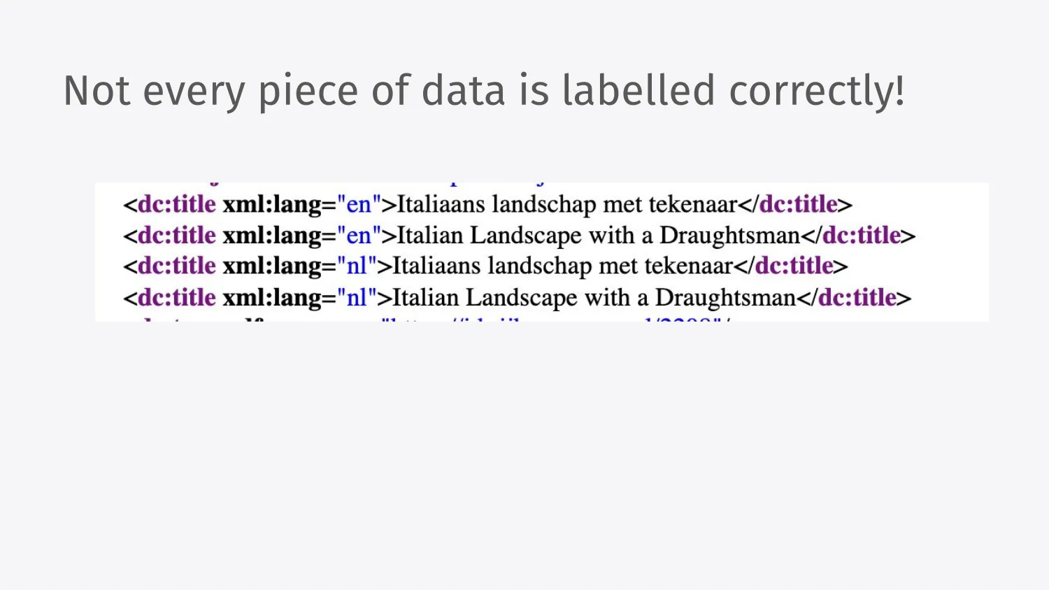 Then the fun starts, because you collect these records and you start to see that not every piece of data is labeled correctly. This is true of any given dataset, but particularly true here, because this data has been collected over lots and lots of time and who amongst us has not had the wrong language for a title or duplicate data or anything in any of our data. This is where data sense and really really looking at and being hands-on with the data really helps.
