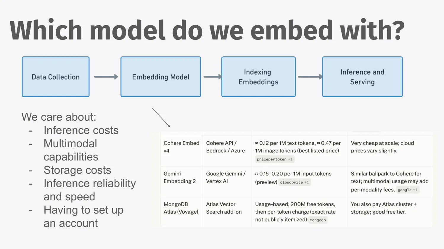 There are a lot of other factors we care about when selecting an embedding model, such as inference costs, storage costs, and the overhead of setting up a new account. For me, multimodality was also important (whether the model was trained on both images and text) because that becomes relevant for retrieval.