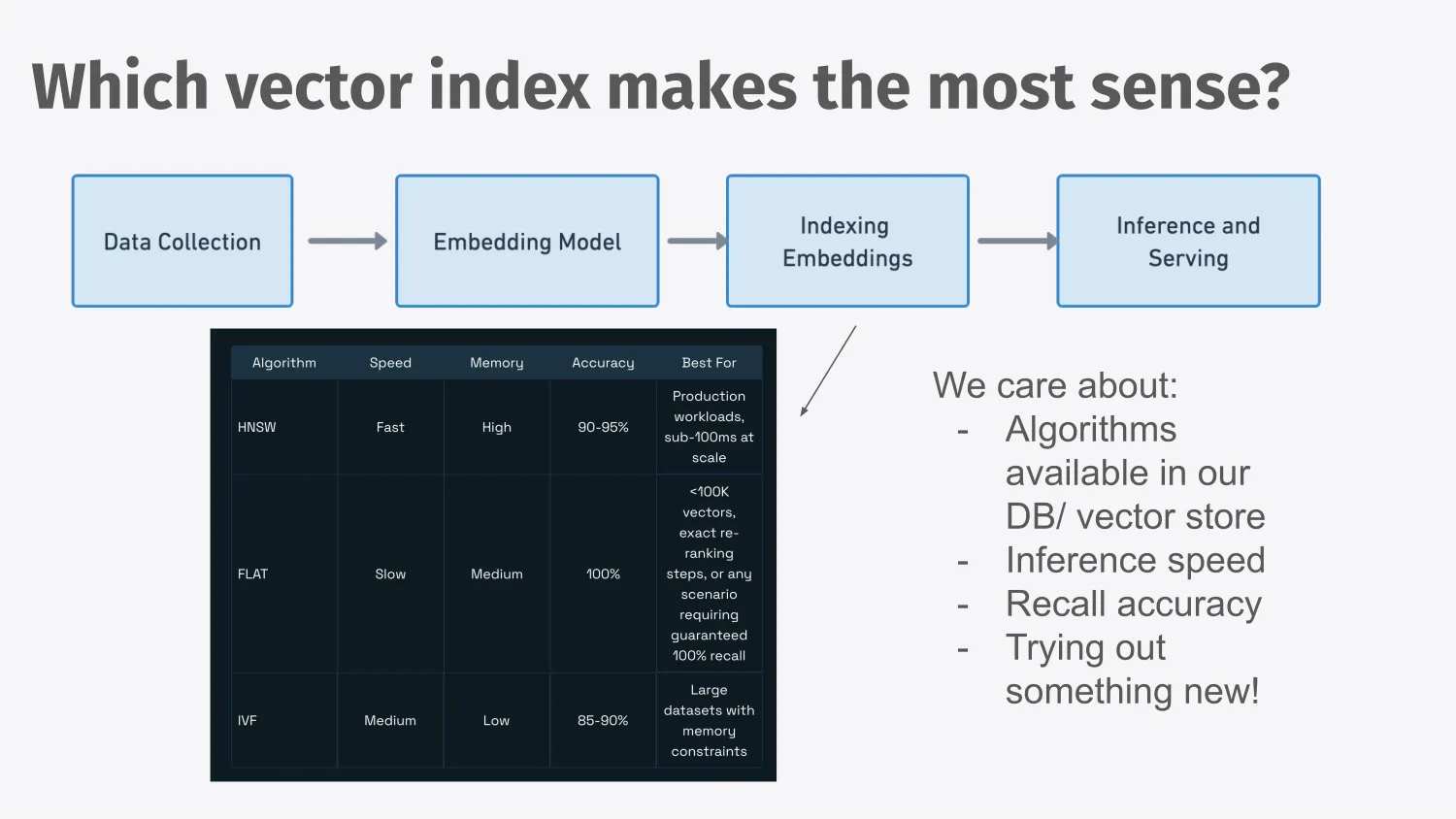 And then you have to pick which vector index you’d like to use. The index is the data structure that helps you quickly find related items.