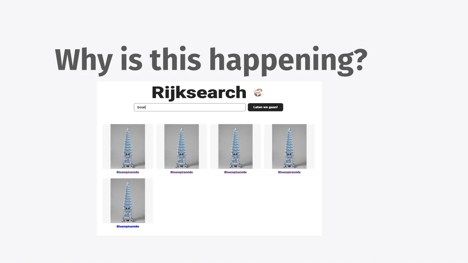 So then you embed everything, and then you start to get your results. And of course, because this is a data-intensive project, you get this thing where you query for “boat”, and you get the same thing for every single result, which doesn’t look like a boat at all. But there’s a pyramid, and you’re like, okay, why is this happening?