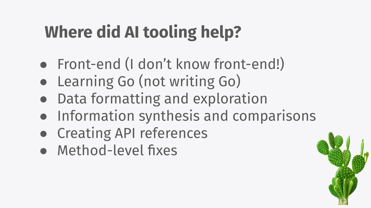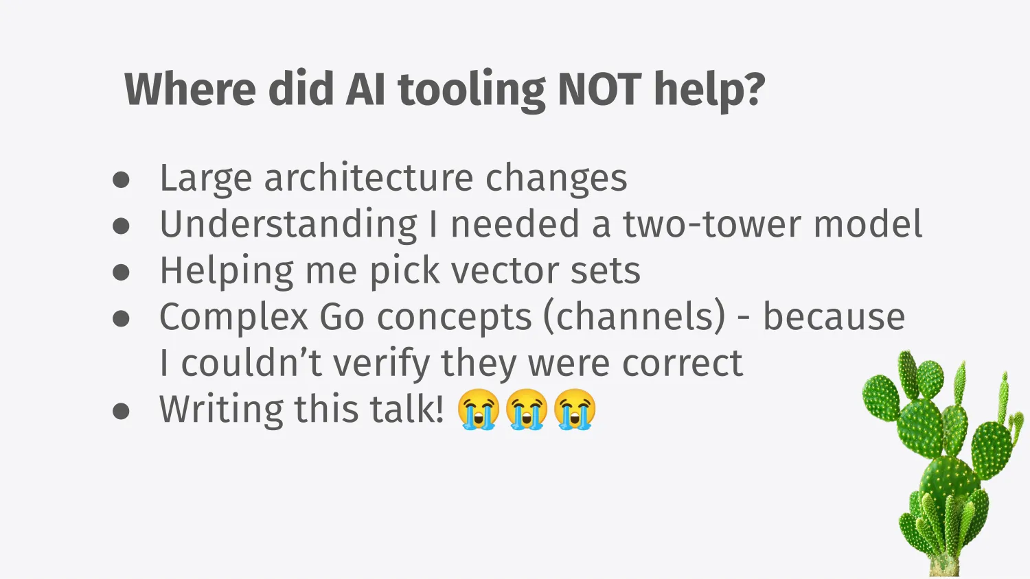 More complex concepts like Go channels , which I haven’t gotten to, were also a weak spot. I couldn’t verify whether what it gave me in Go was actually correct, and had a lot of non-idiomatic code until I got an actual experienced Go developer to take a look and review “my” code. And of course, AI didn’t help in writing this talk. It took a very long time, and none of it was written with AI. It all came from ideas that had been slowly combining in my head. Which brings me to the final point: it takes time to build good things.