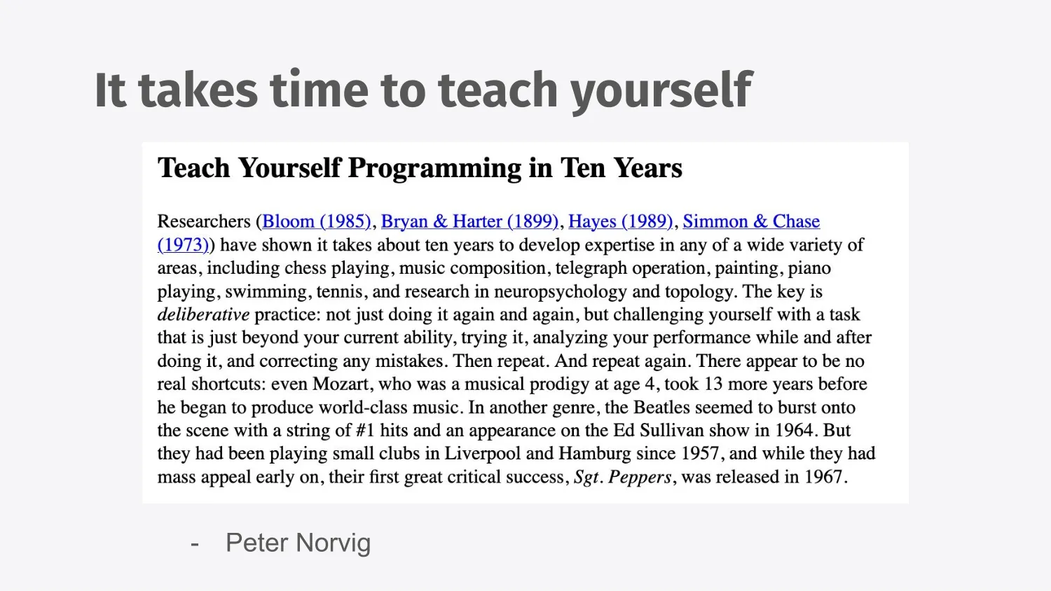 Peter Norvig wrote this post a long time ago about teaching yourself programming in 10 years. There is no shortcut for deliberative practice, which is what we’re trying to do here when we build ourselves flowers.