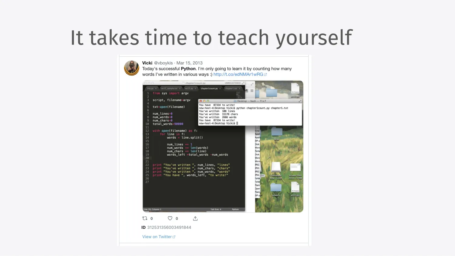 For me, I found it takes time because I was going through my tweet archive to see what I could find for this talk. In 2013, I wrote about how I was learning Python and counting words and just really struggling through it. And it’s like, it’s not very optimal and I don’t really understand what’s going on and what RGV is, etc. And then 10 years later I was able to do Viberary just through deliberate practice. And three years later, I did it again, in Go, with multimodal embeddings.