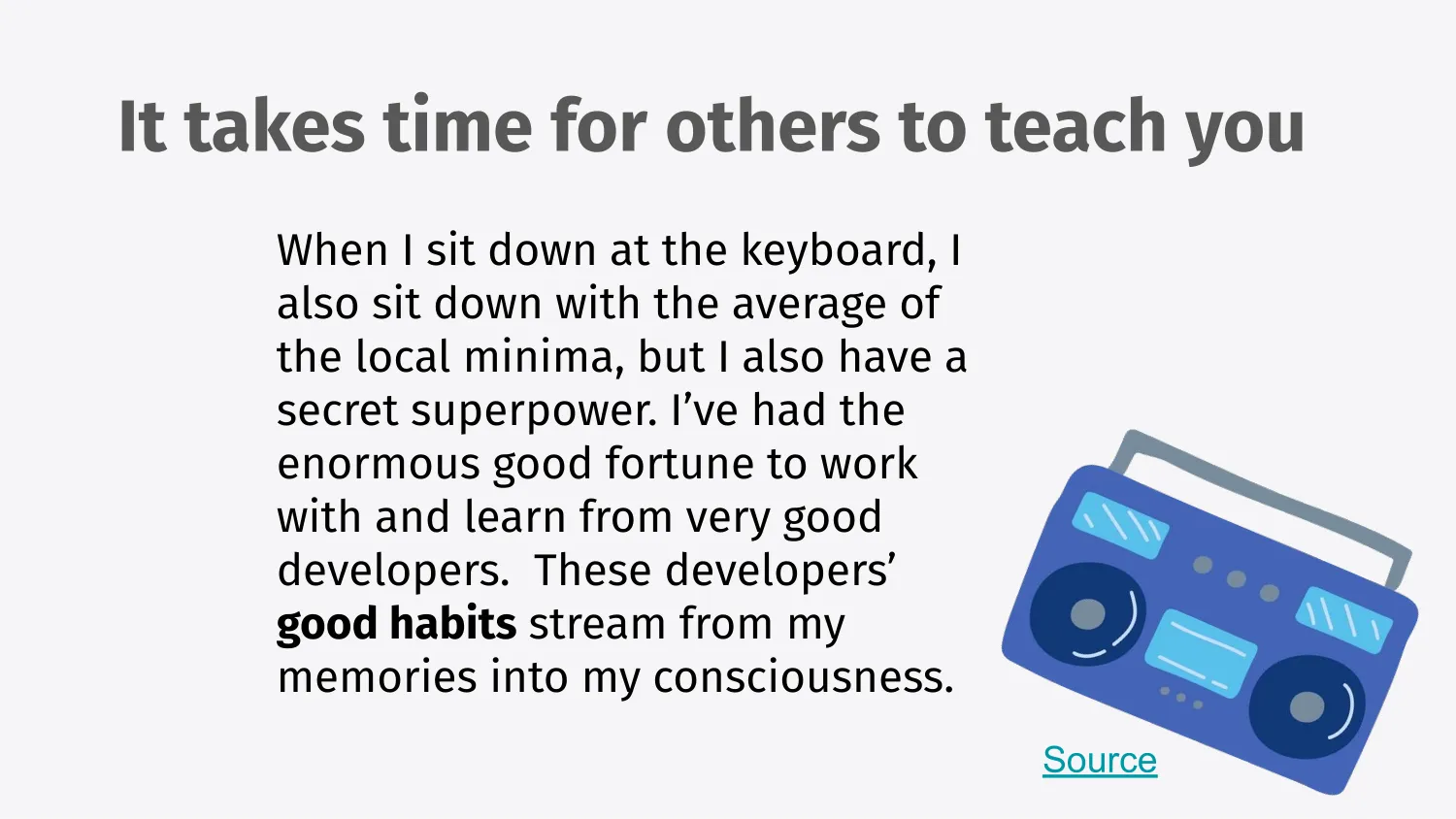 Anne Lamott talks about this alphabet radio that plays in your head. Of all the past people that have either criticized or praised you and how you have to tune some of them out selectively when you work. For me, it’s all the people that have reviewed my code and that I’ve worked with and the ones that I respect are always echoing in my head. That kind of feedback comes from good mentorship. That’s the apprenticeship that Rachel went through as well right so it takes time to get good at that.