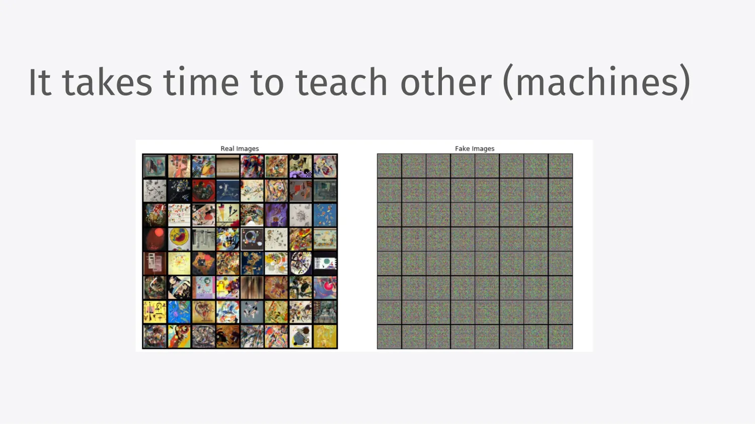 It also takes time to teach others. So this is another small example from another side project I did before called Gandinsky, where I tried to train a generative adversarial network to paint pictures in the style of Vassily Kandinsky. At the time, this didn’t work well. This was like eight years ago, and it didn’t work because you need thousands of samples to train a GAN and Kandinsky unfortunately in all his wisdom only painted 200 paintings.
