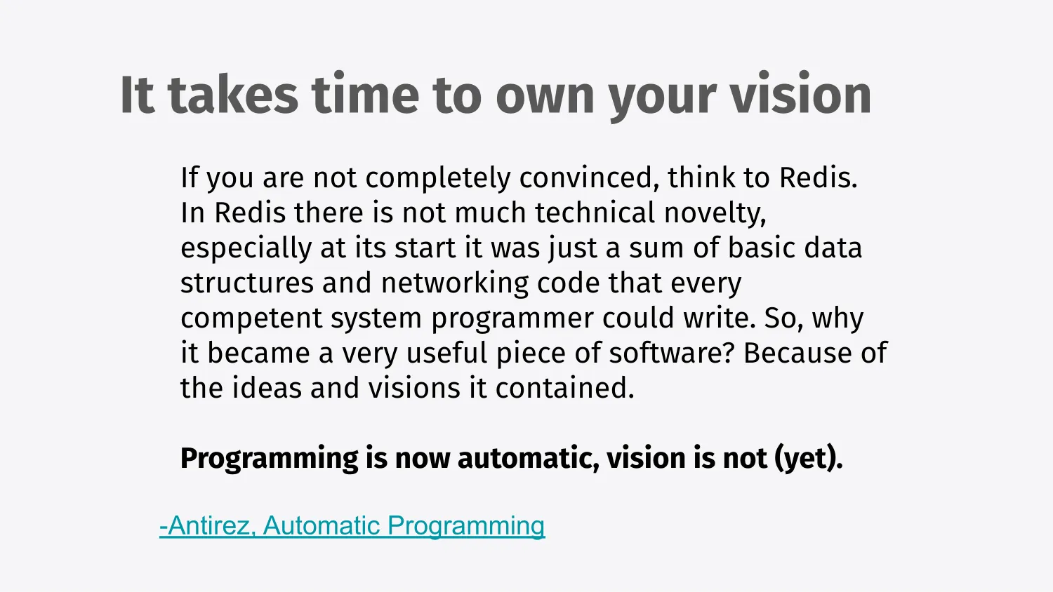 And finally, it takes time to own your own vision, as in this quote is from antirez and his recent thoughts on agentic programming.