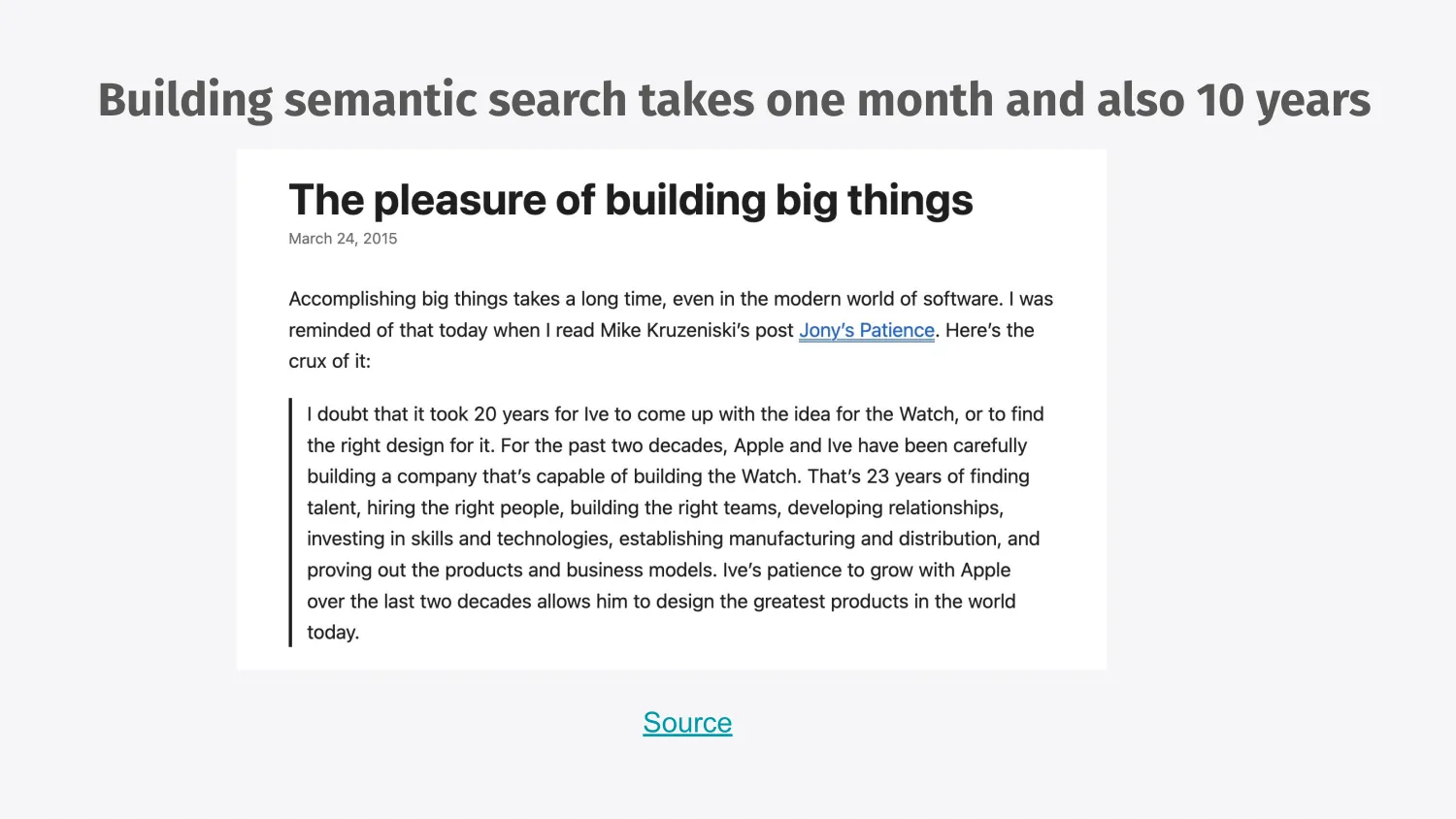 Programming as an automatic vision is not yet. That only comes from doing the work over and over and over again. So building a semantic search engine really took me about a month once I buckled down and did it (though I’m still not entirely done). But it also took me 10 years to do this. And I think that’s important to keep in mind.